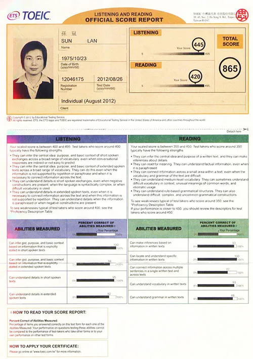 基於工作需求及自我提升的需求,英文已經成為一個不得不具備的基本技能,其中就已多益最為貼近工作需求,也最為實用,考題也是從工作實務挑選出來。所以當初就是以一次考取黃金證書為目標。在還沒有開始在洋碩多益解題班上課前,一開始自我測試的時候只有600多分,尤其閱讀題目很難在時間內完成,但在洋碩多益解題班老師三個月的帶領下,一次攻下黃金證書865分。 寫完所有題目還有很多時間可以從容的檢查。效果顯著!